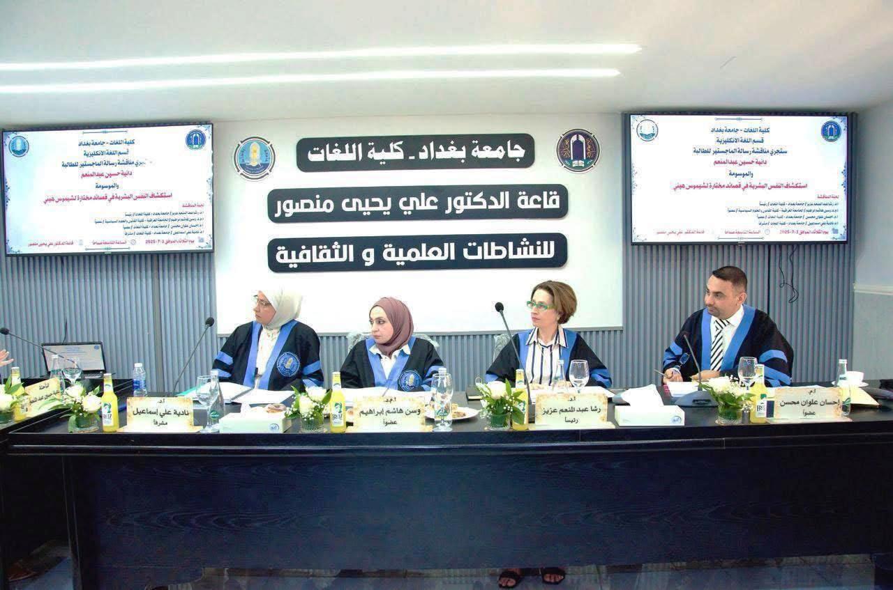 The Department of English at the College of Languages, University of Baghdad, discussed a master’s thesis titled (Exploring the Human Psyche in Selected Poems by Seamus Heaney) by student Dania Hussein Abdul Moneim.