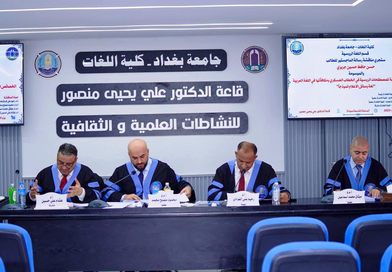 The Department of Russian at the College of Languages, University of Baghdad, examined the Master’s thesis entitled “Functional Features of Russian Military Terms and their Equivalents in Arabic: A Case Study of Media Language” by the master’s degree candidate Hasan Hafiz Hussein Jreizi.