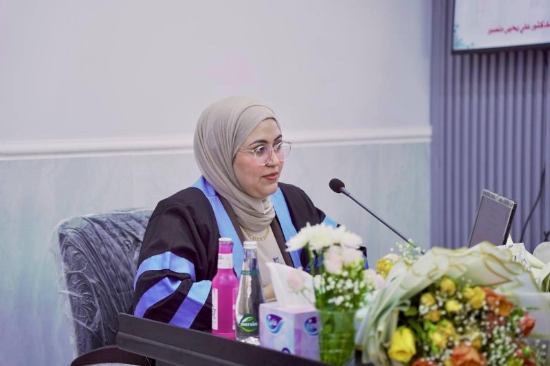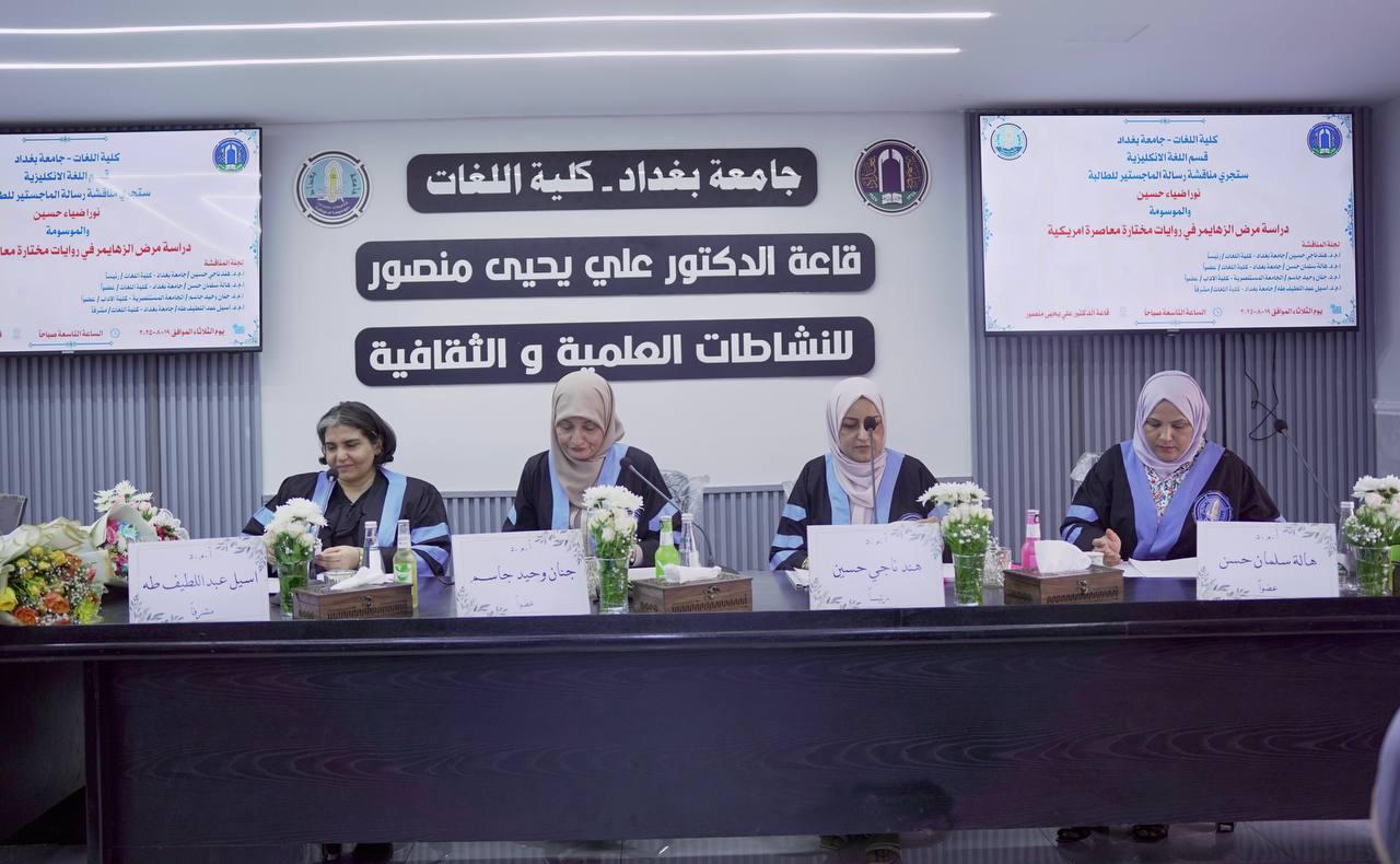 On Monday, August 19, 2025, the Department of English at the College of Languages, University of Baghdad, held a discussion for the master’s thesis titled “A Study of Alzheimer’s Disease in Selected Contemporary American Novels” by graduate student Noora Diaa Hussein.