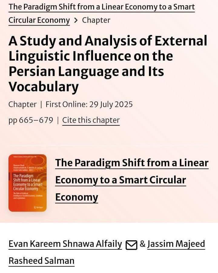 Two faculty members from the Department of Persian Language at the College of Languages, University of Baghdad (Lecturer Ivan Kareem Shanawa and Assistant Lecturer Jasim Majid Rashid) have published a joint research paper titled “External and Lexical Support of the Persian Language: A Semantic Study” in Springer Journal.